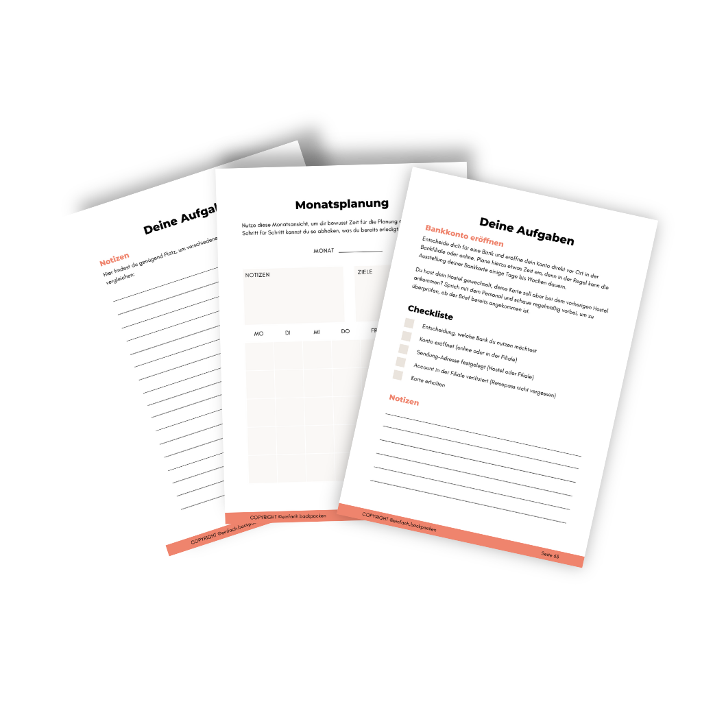 ➯ Zielgerichtete Aufgaben, welche dir helfen den Überblick zu behalten und erfolgreich dein Work and Travel zu realisieren – ganz ohne Stress etwas zu vergessen!